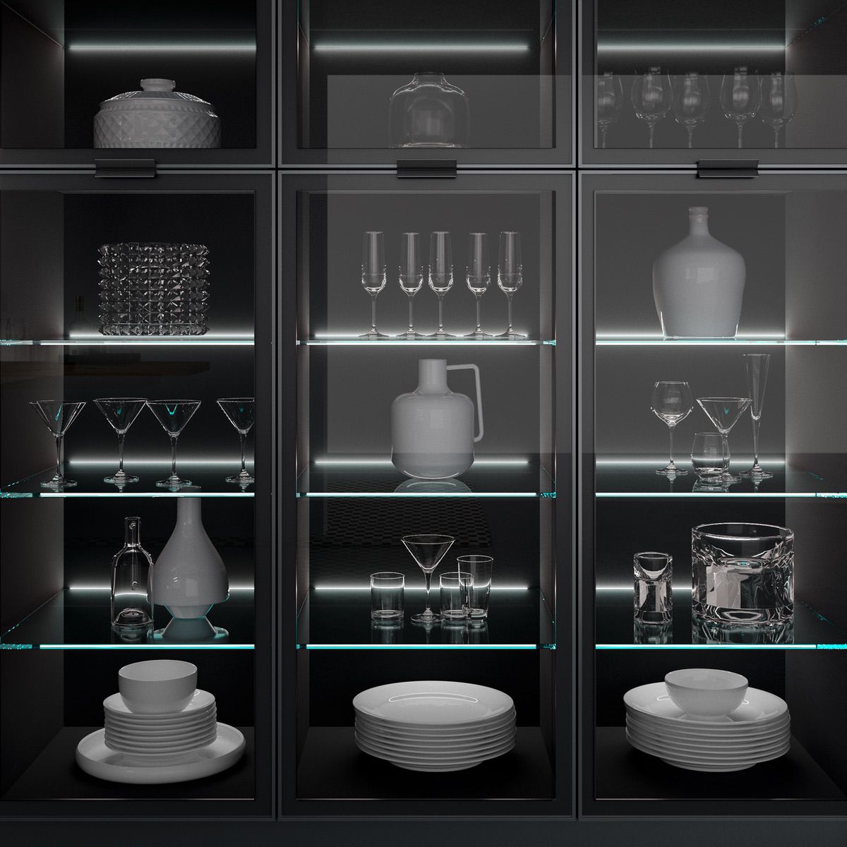 Inoltre Zen esalta un altro gioiello in cucina: le vetrine col telaio in alluminio anodizzato nel colore nero, arricchite dal vetro armato. Una rete metallica all’interno, conferisce un’ottima resistenza agli urti. Zen rappresenta la forza della bellezza.